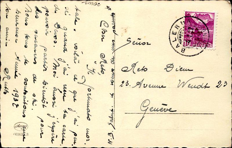 Feuchtigkeitsbedingte Wölbung, Stempelflecken auf Vorderseite, Kanten bestossen, Markierungen mit Kugelschreiber, Verblasst, Ecken bestossen