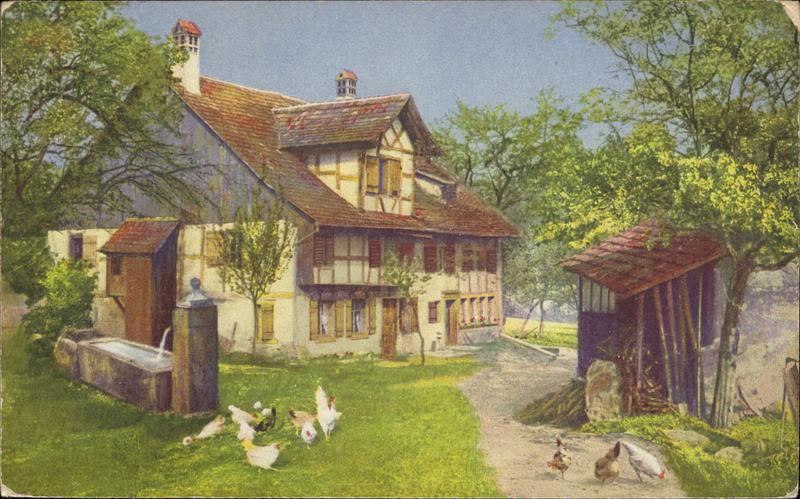 Zustandsbeschreibung der Ansichtskarte "Hühner im Hof"