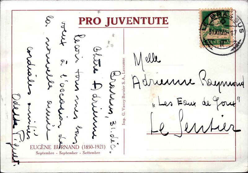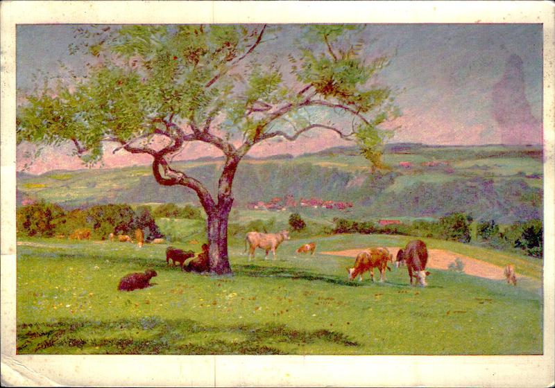 Zustandsbeschreibung der Ansichtskarte "Weide mit Kühe - Eugène Burnand"