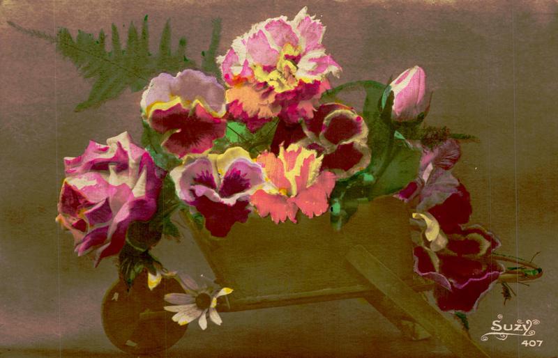 Zustandsbeschreibung der Ansichtskarte "Blumen in Schubkarre"