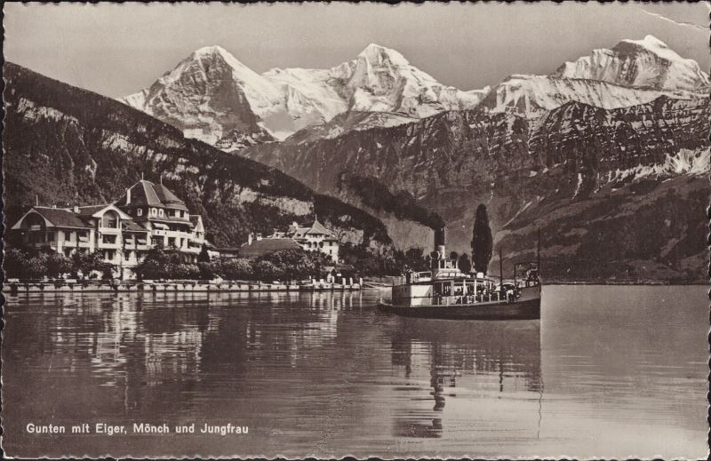 Zustandsbeschreibung der Ansichtskarte "Gunten mit Eiger Mönch und Jungfrau"