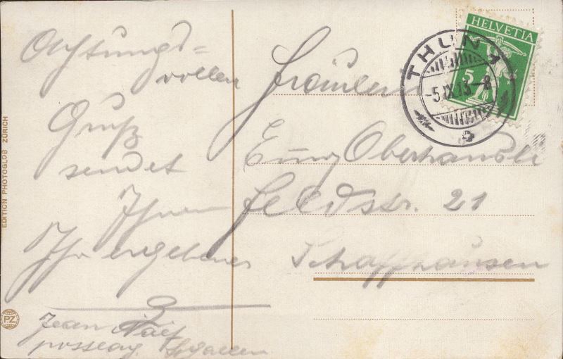Zustandsbeschreibung der Ansichtskarte "Thun und die Alpen"