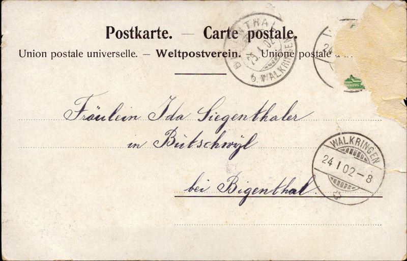 Befleckt, Briefmarke fehlt, stark beschriftet, zwei Risse am oberen Rand