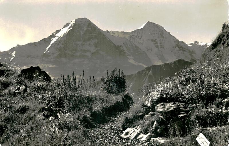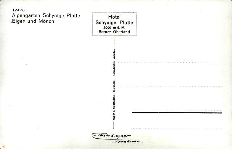 Zustandsbeschreibung der Ansichtskarte "Alpengarten Schynige Platte mit Eiger und Mönch"