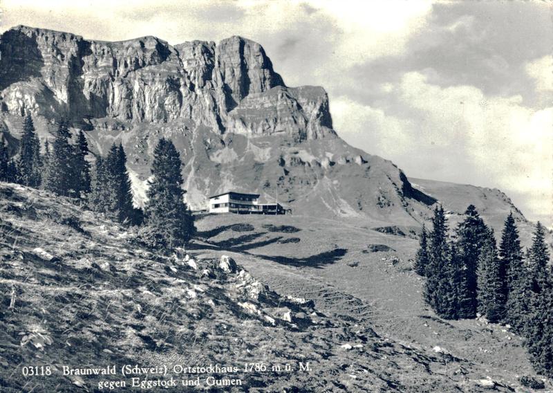 Zustandsbeschreibung der Ansichtskarte "Braunwald Ortstockhaus gegen Eggstock und Gumen"