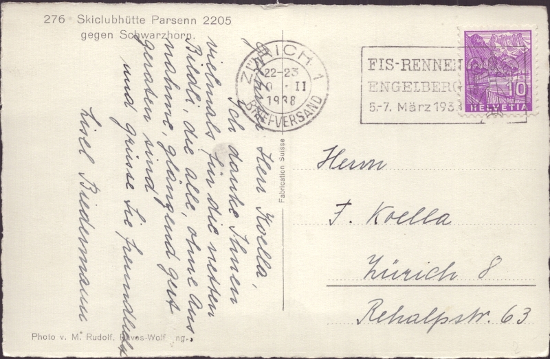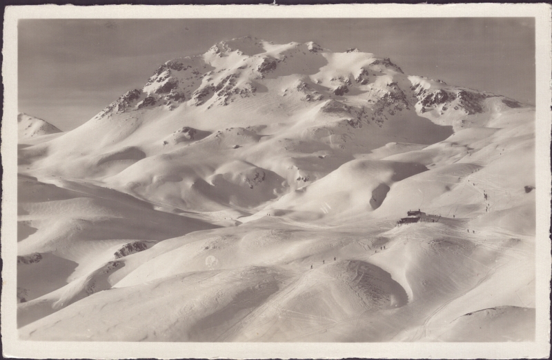 Zustandsbeschreibung der Ansichtskarte "Skiclubhütte Parsenn gegen Schwarzhorn (3146 m)"