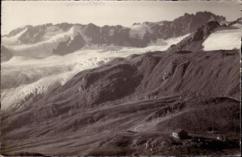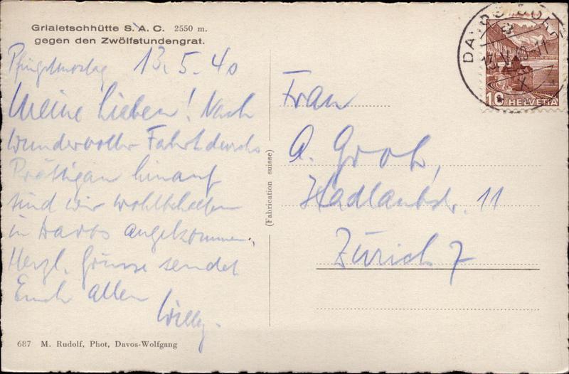 Zustandsbeschreibung der Ansichtskarte "Grialetschhütte gegen den Zwölfstundengrat. 1940"