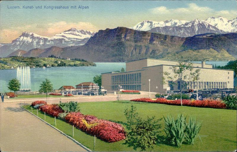 Luzern. Kunst- und Kongresshaus mit Alpen.