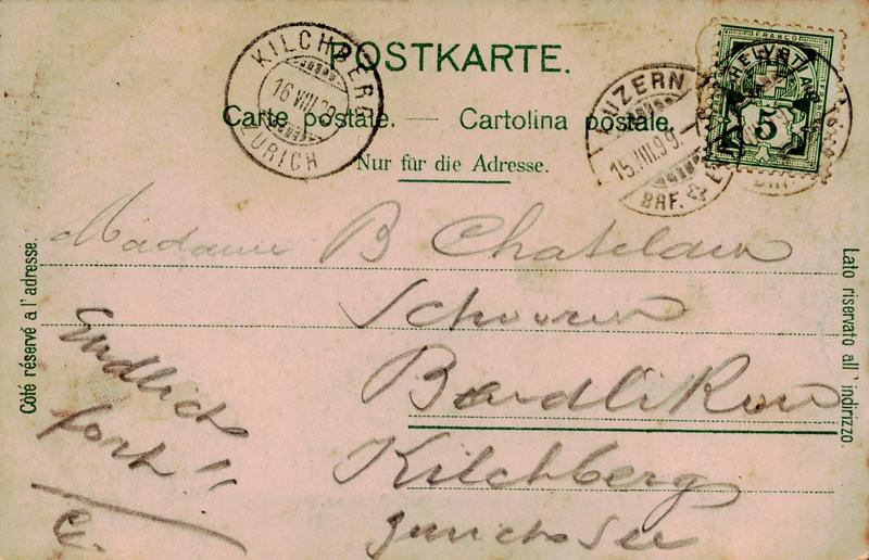 Kapellbrücke mit Wasserthurm und Rathaus, Luzern um 1899 Rückseite