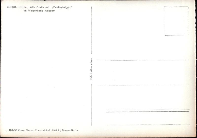 Zustandsbeschreibung der Ansichtskarte "Bosco - Gurin. Alte Stube mit ''Seelenbalgge''"