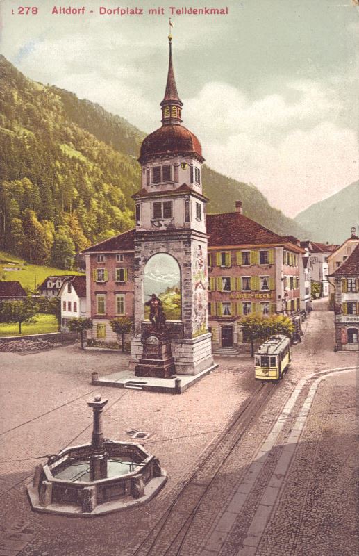 Zustandsbeschreibung der Ansichtskarte "Altdorf Dorfplatz mit Telldenkmal"
